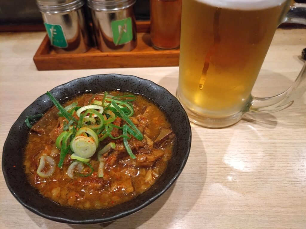 牛すじ煮込みと一番絞り生を飲み、